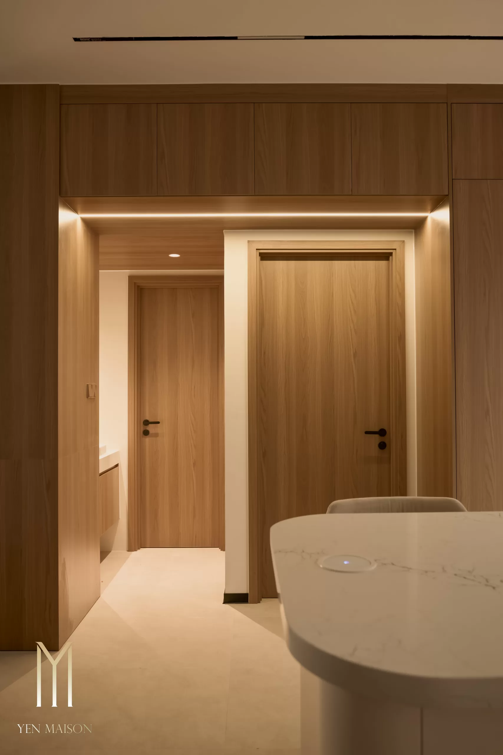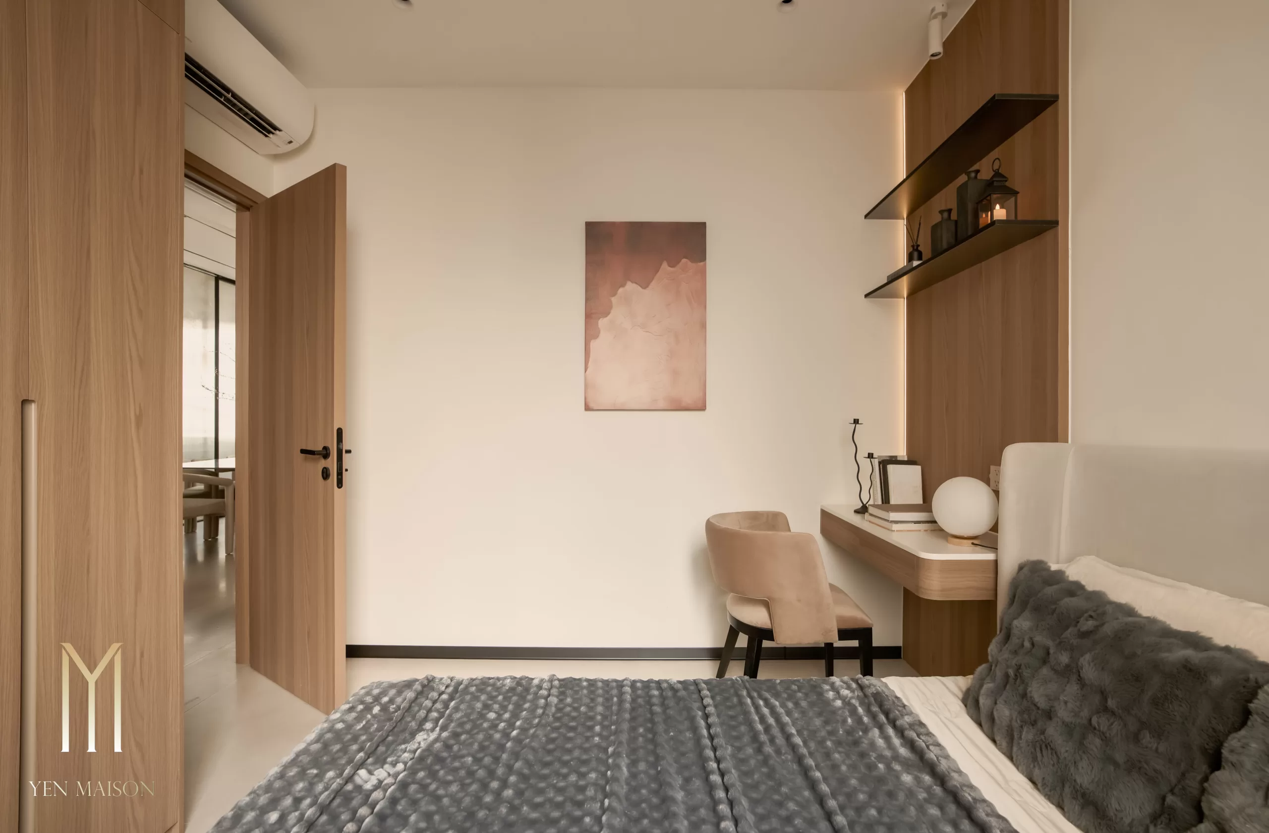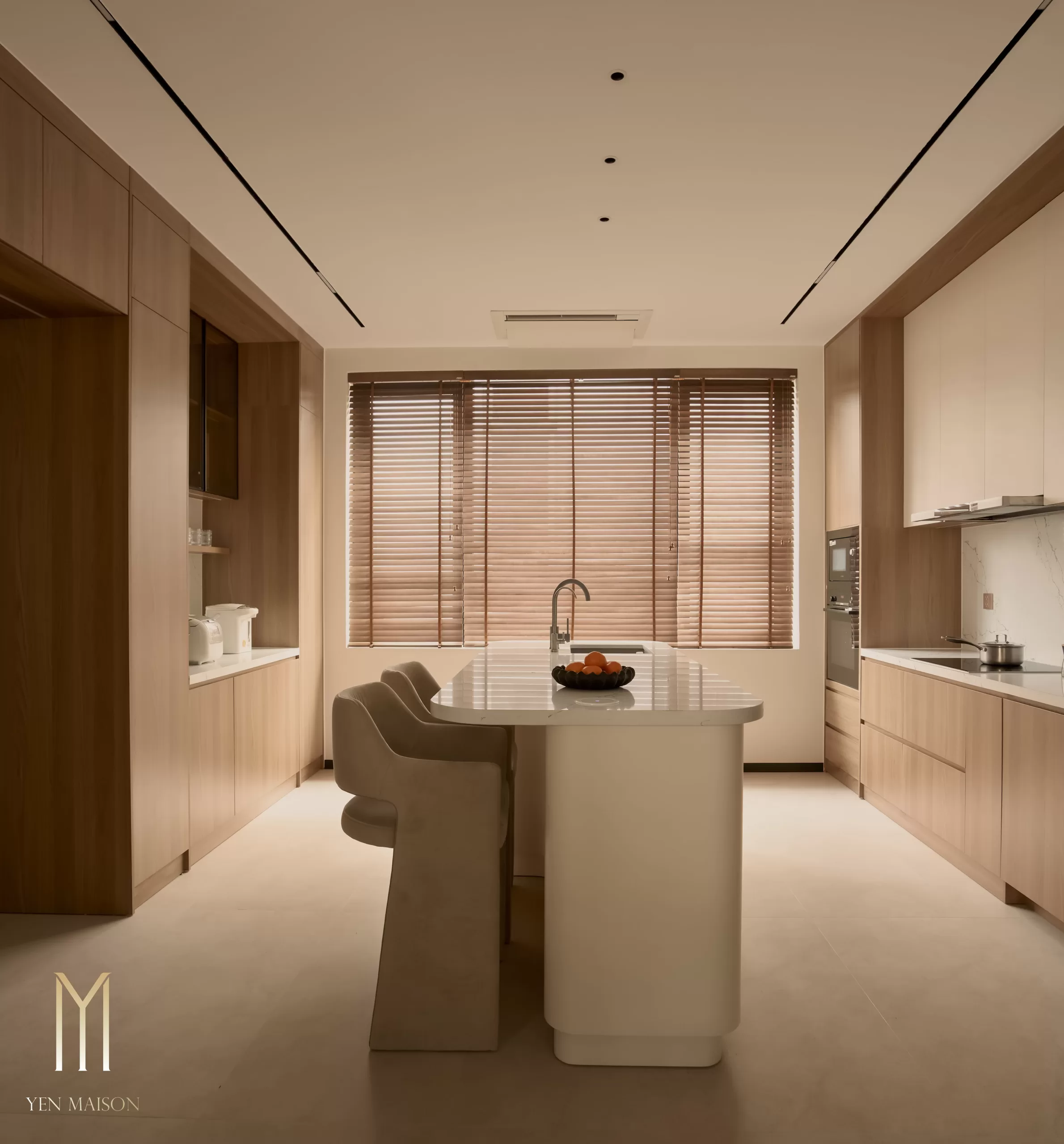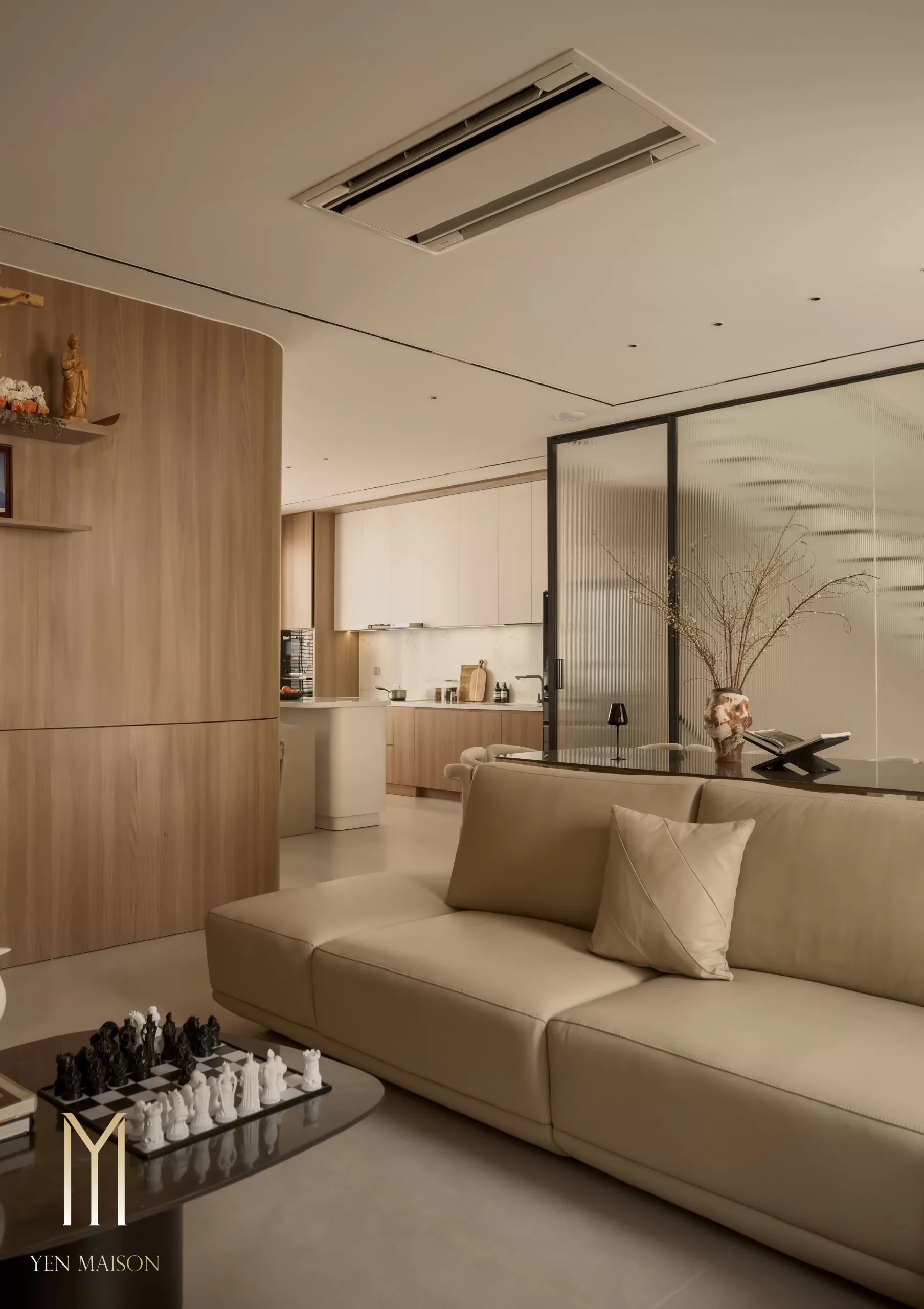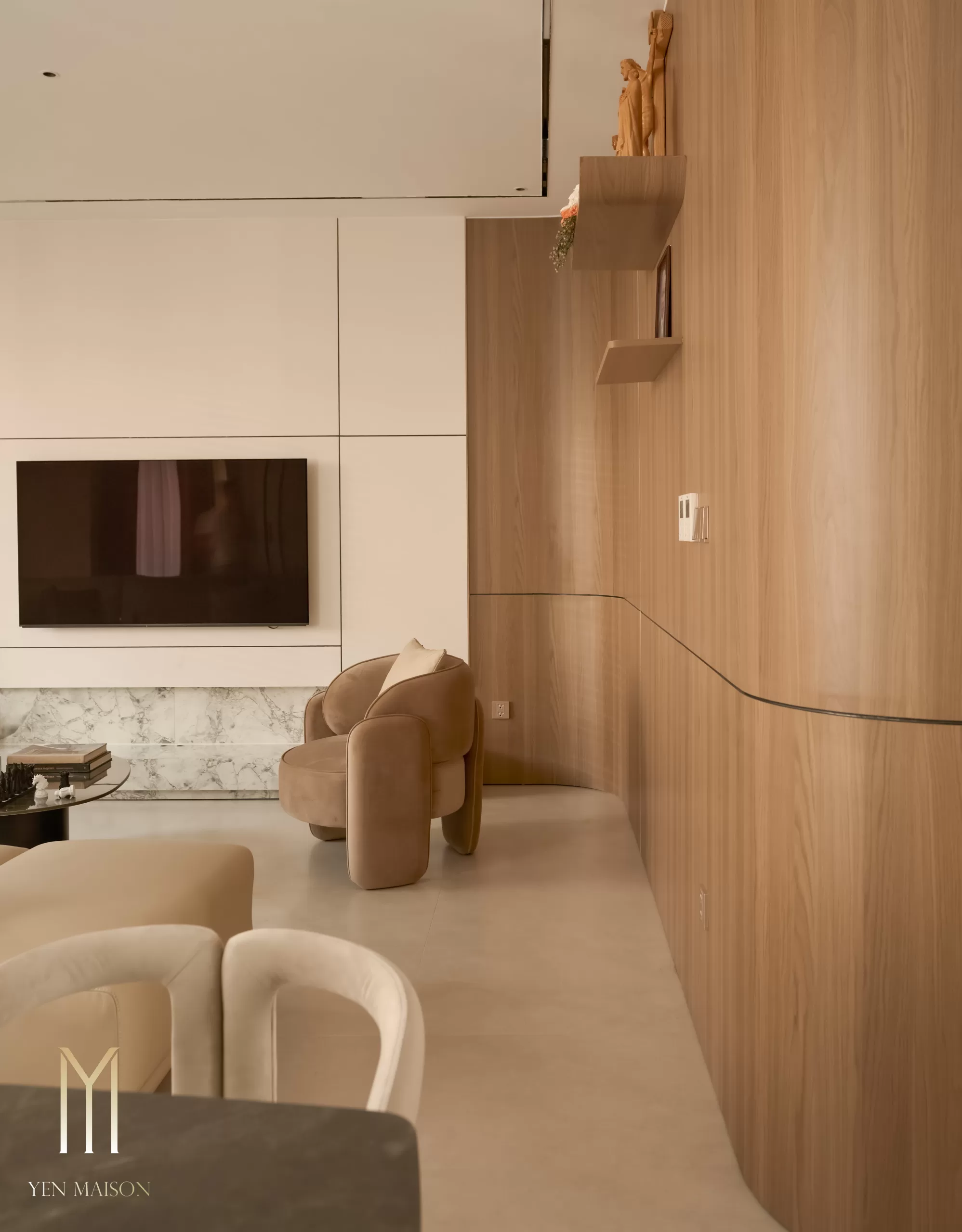 Tông trắng chủ đạo kết hợp beige và vân gỗ trầm tạo nên một tổng thể dịu mắt và ấm áp. Nội thất được xử lý gọn gàng, đường nét tinh giản, ánh sáng tự nhiên được khai thác tối đa giúp không gian luôn thoáng đãng và dễ chịu suốt cả ngày dài.