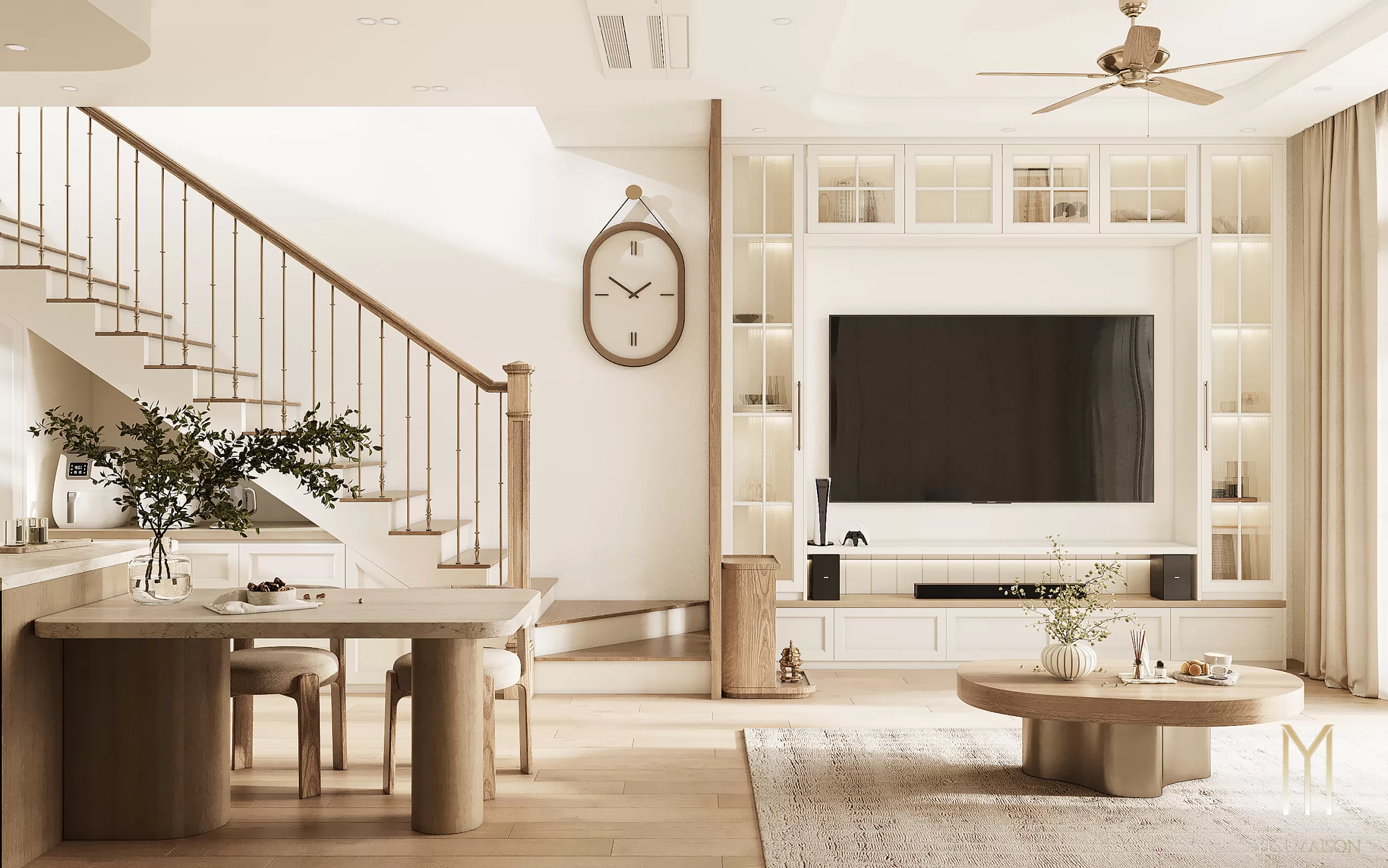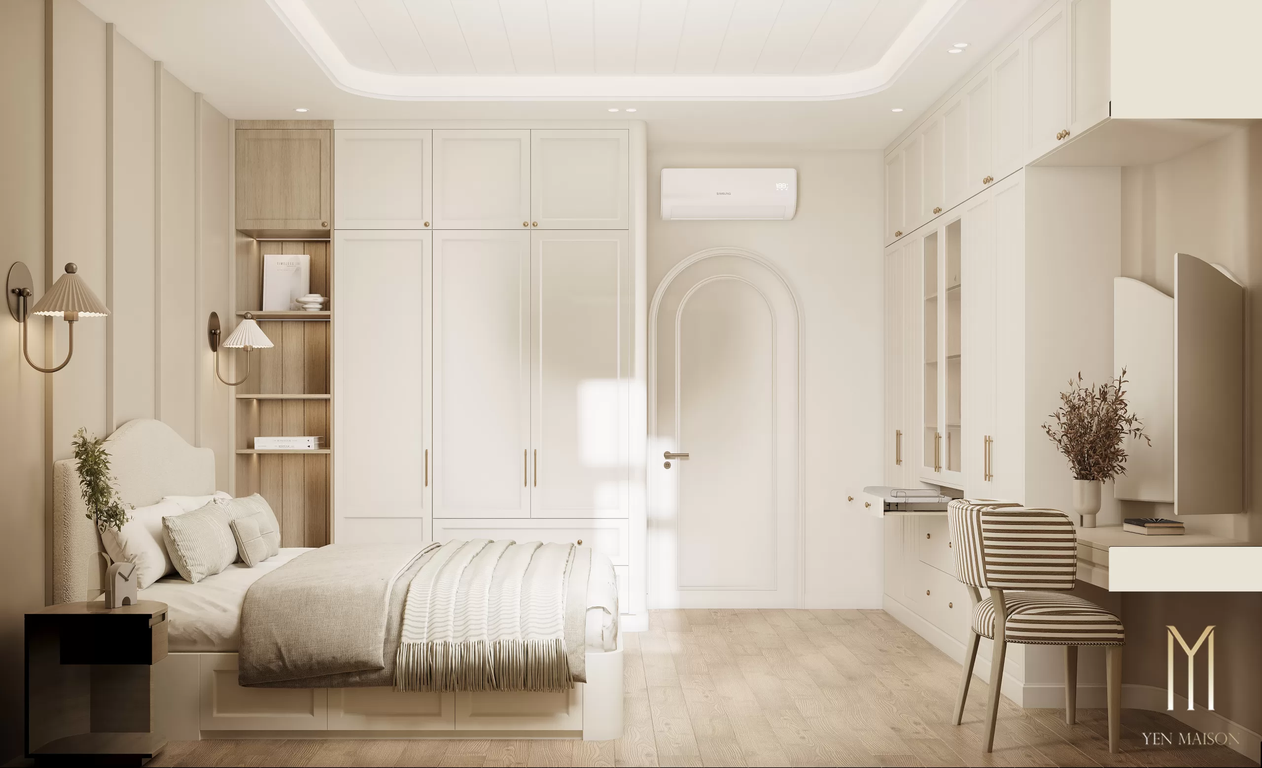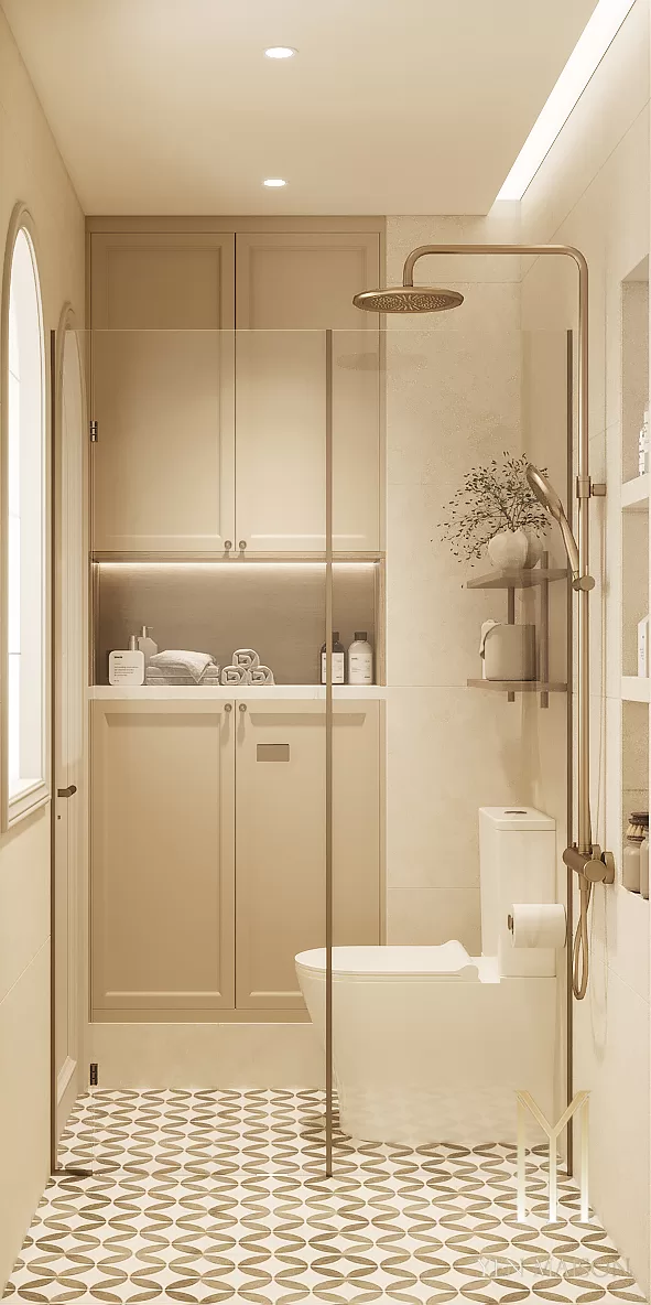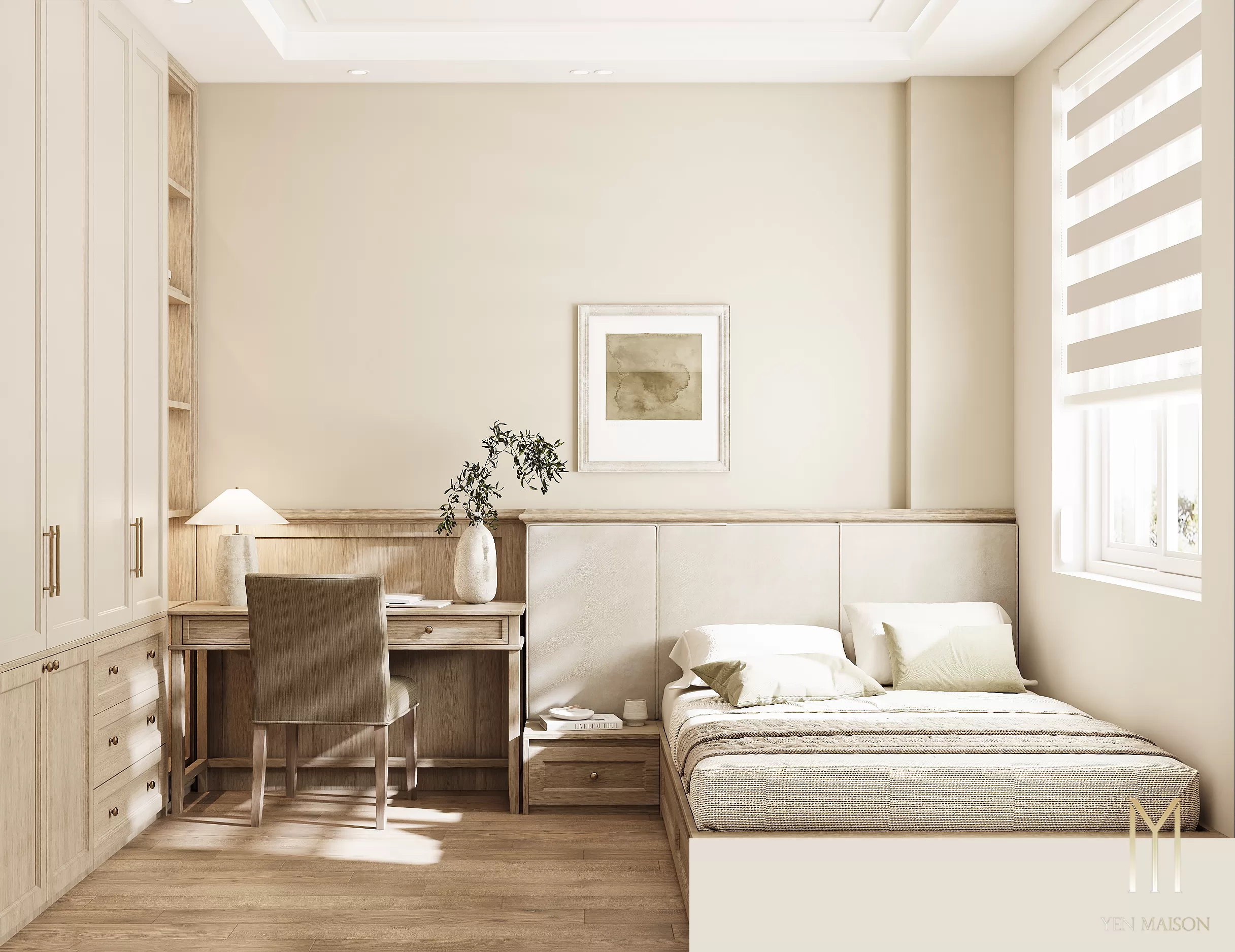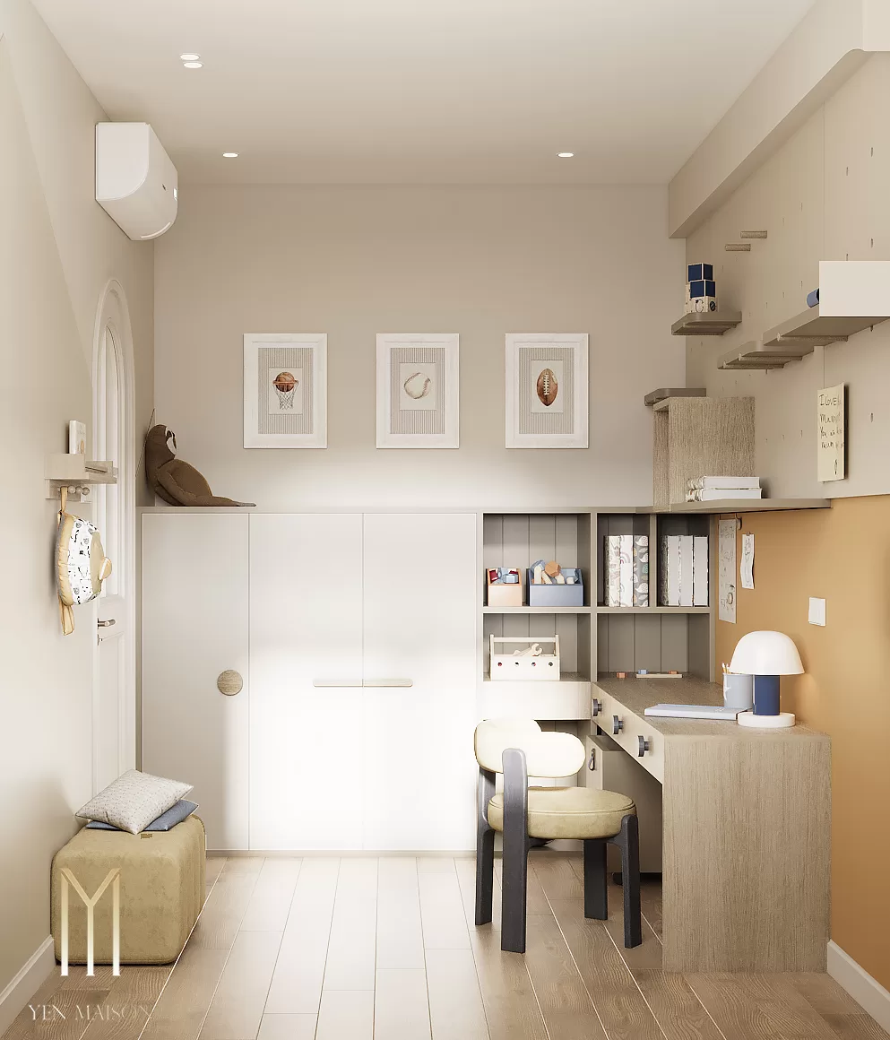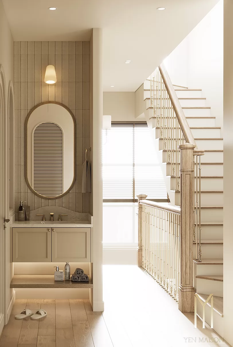 Các chi tiết được giản lược vừa đủ, để ánh sáng và vật liệu trở thành yếu tố dẫn dắt cảm xúc. Sắc trắng kem làm chủ đạo khéo léo hòa cùng tông gỗ sáng, mang lại một tổng thể nhẹ nhàng, thoáng đãng và bền vững theo thời gian.