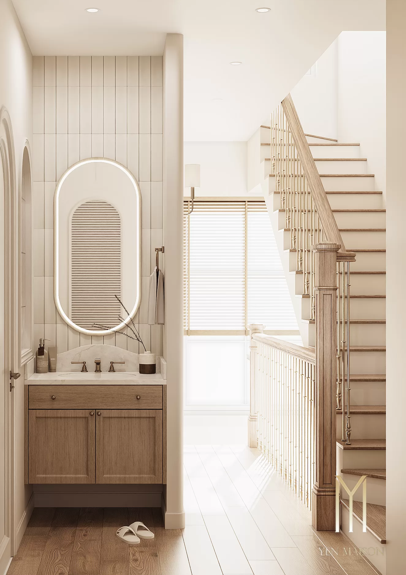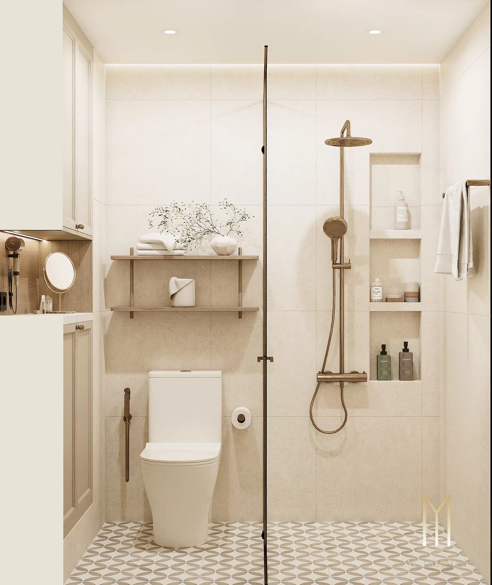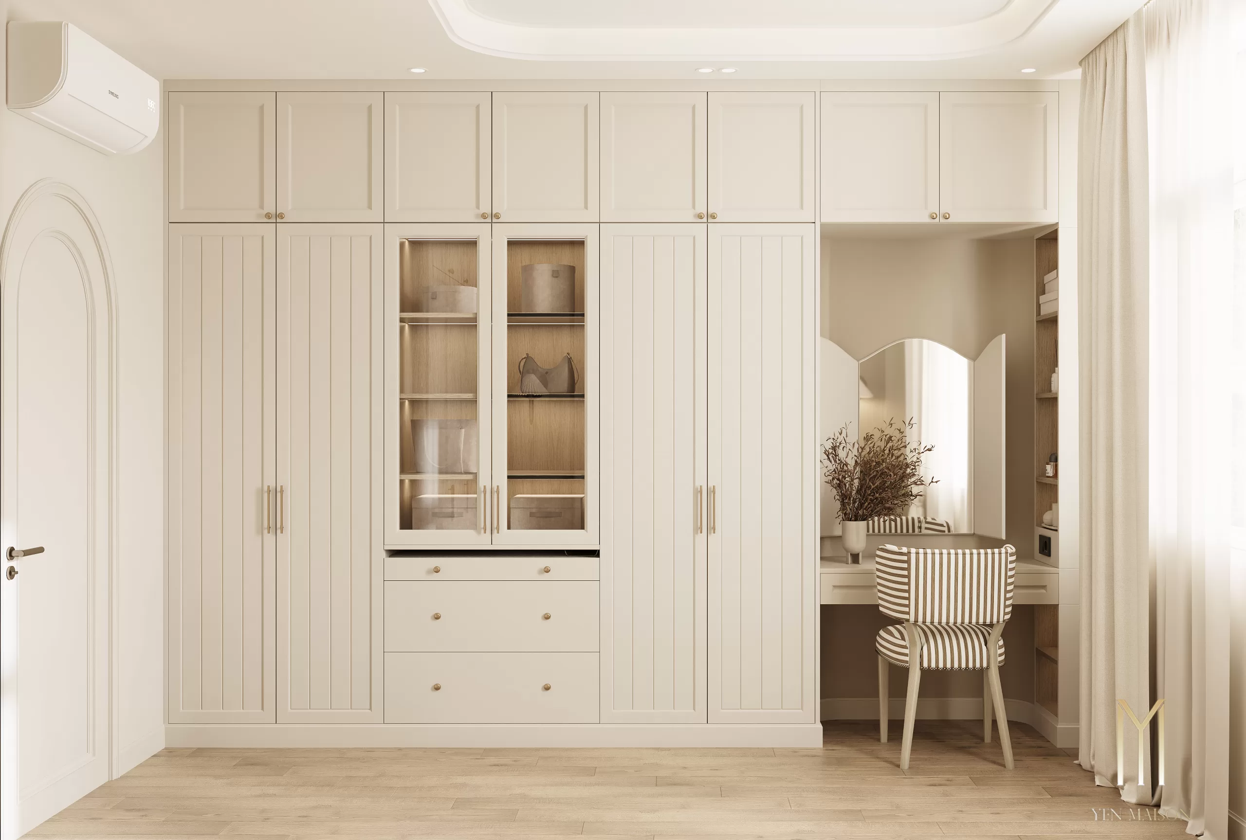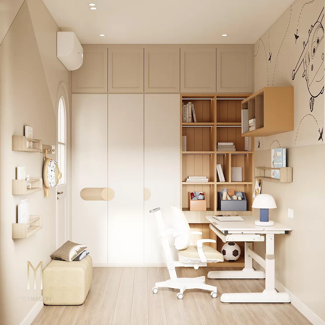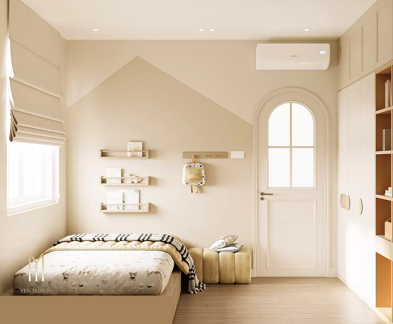 Các chi tiết được giản lược vừa đủ, để ánh sáng và vật liệu trở thành yếu tố dẫn dắt cảm xúc. Sắc trắng kem làm chủ đạo khéo léo hòa cùng tông gỗ sáng, mang lại một tổng thể nhẹ nhàng, thoáng đãng và bền vững theo thời gian.