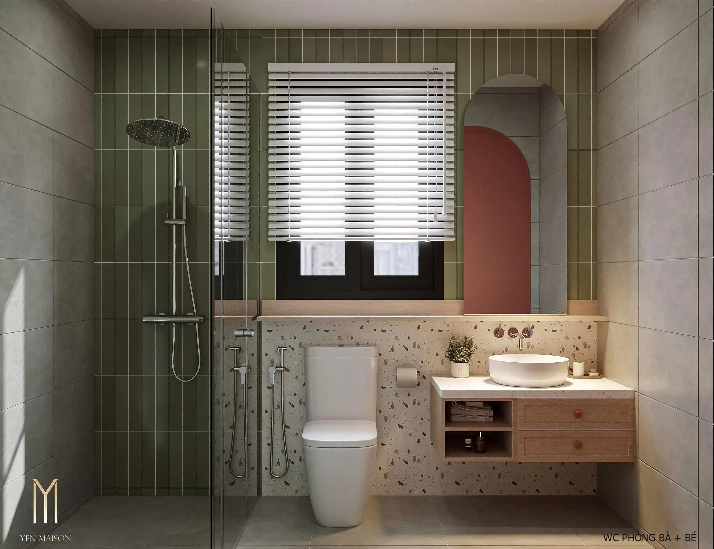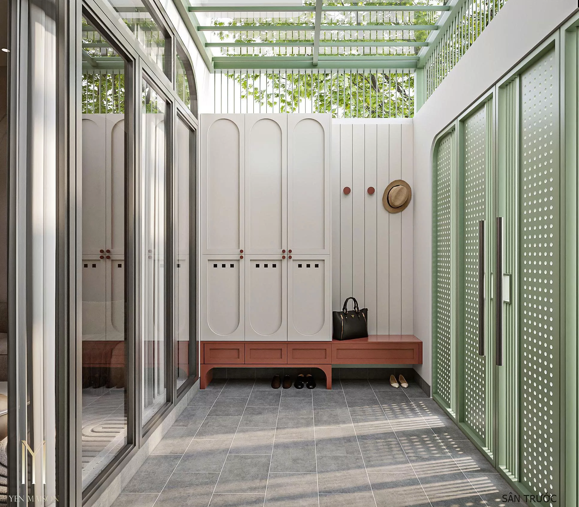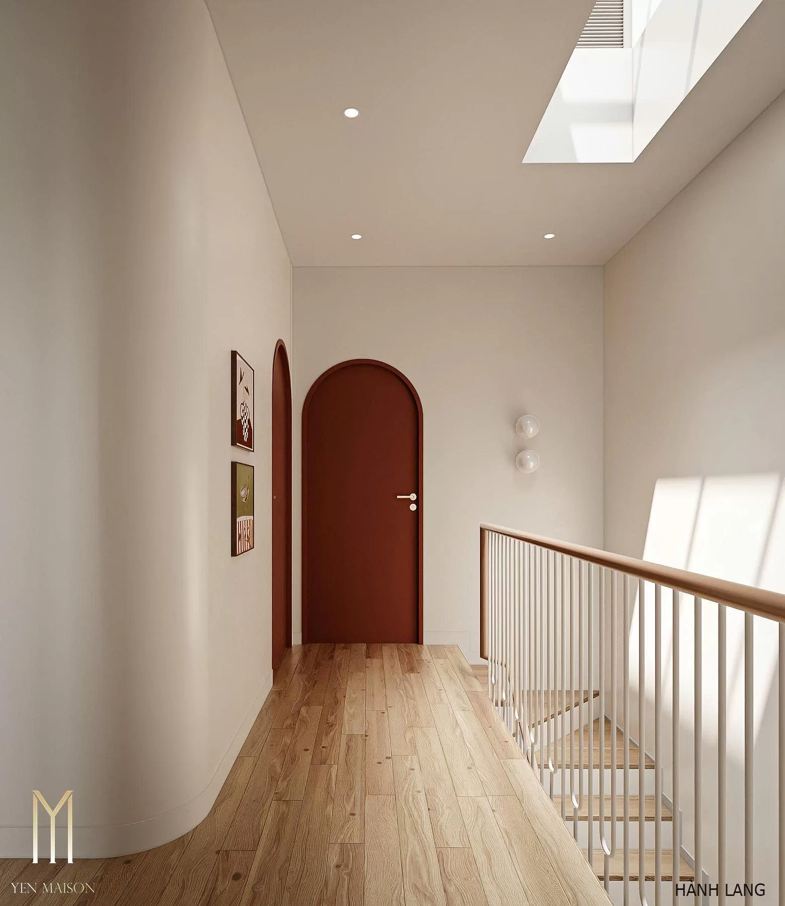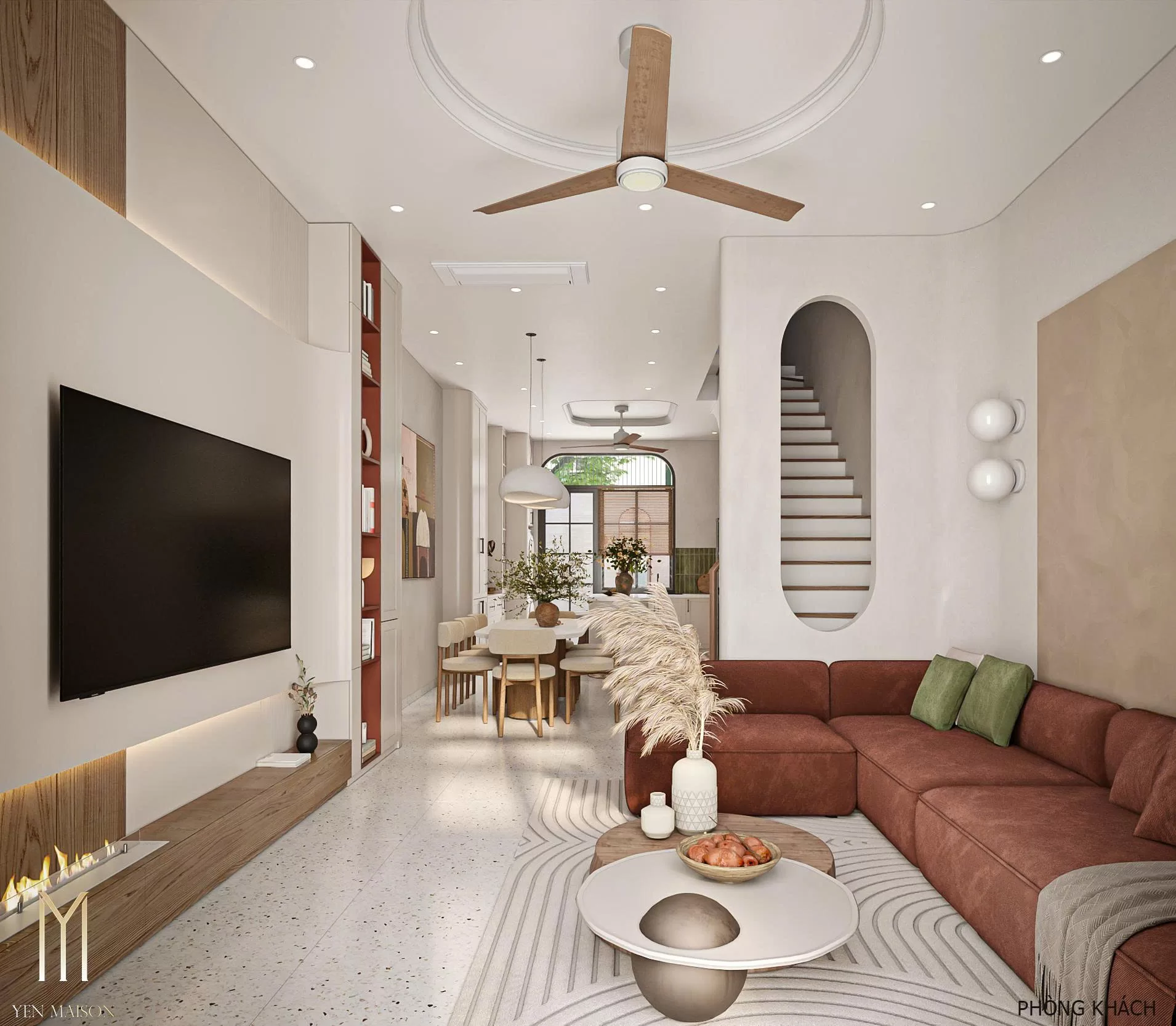 Yen Maison mang đến một ngôi nhà phố theo ngôn ngữ hiện đại với bảng màu trẻ trung. Sắc nâu đỏ của sofa và kệ tủ, hòa cùng gam màu xanh rêu trên gạch ốp tường tạo nên sức hút thị giác ấn tượng. Cửa vòm và những đường cong nhẹ nhàng cho cảm giác mềm mại, duyên dáng.