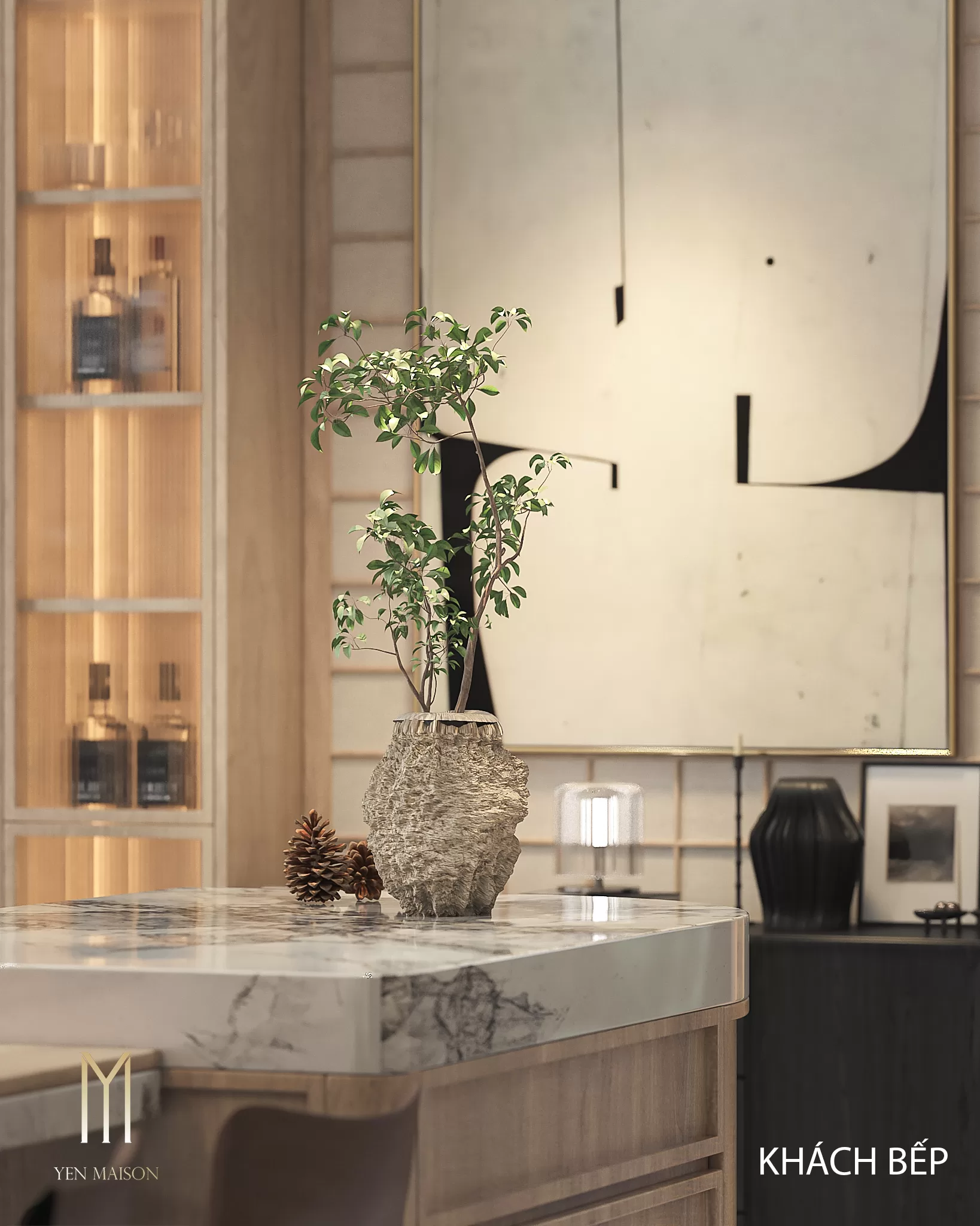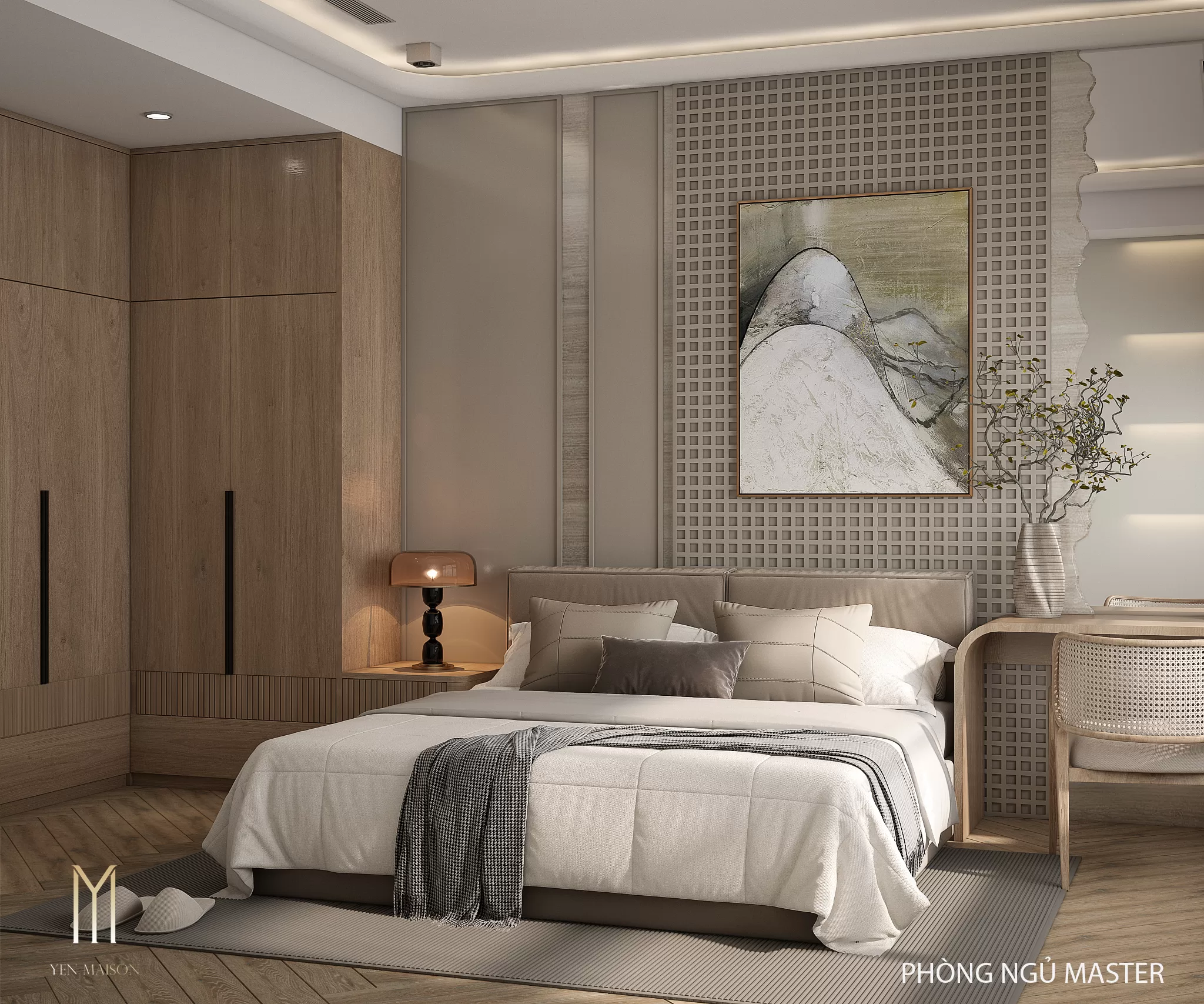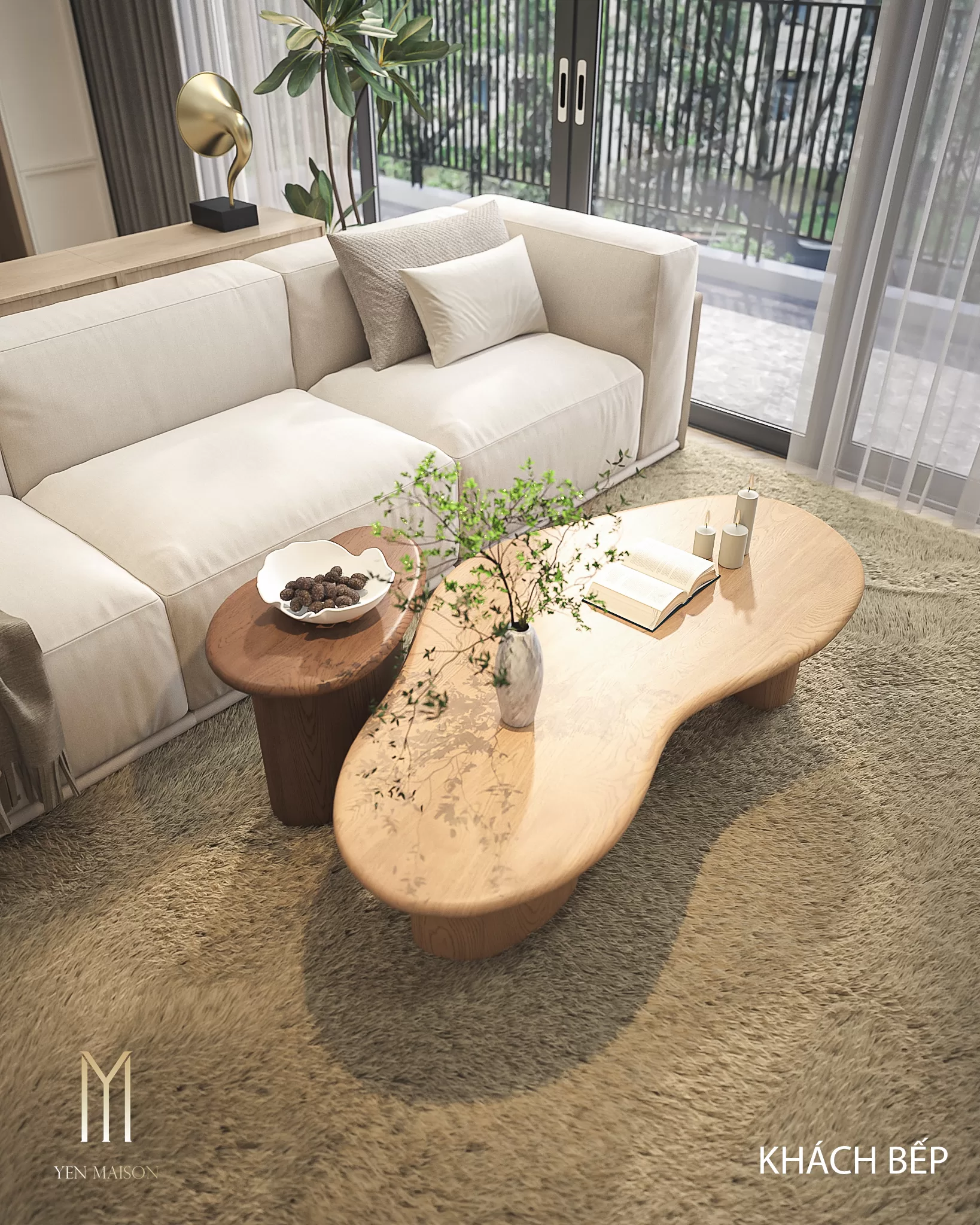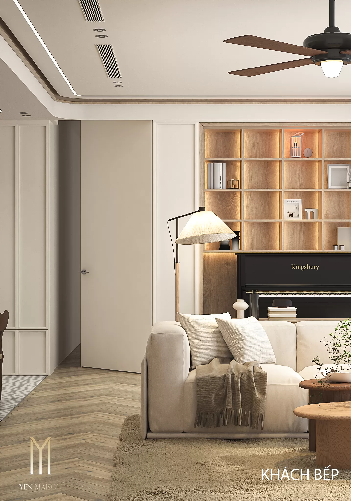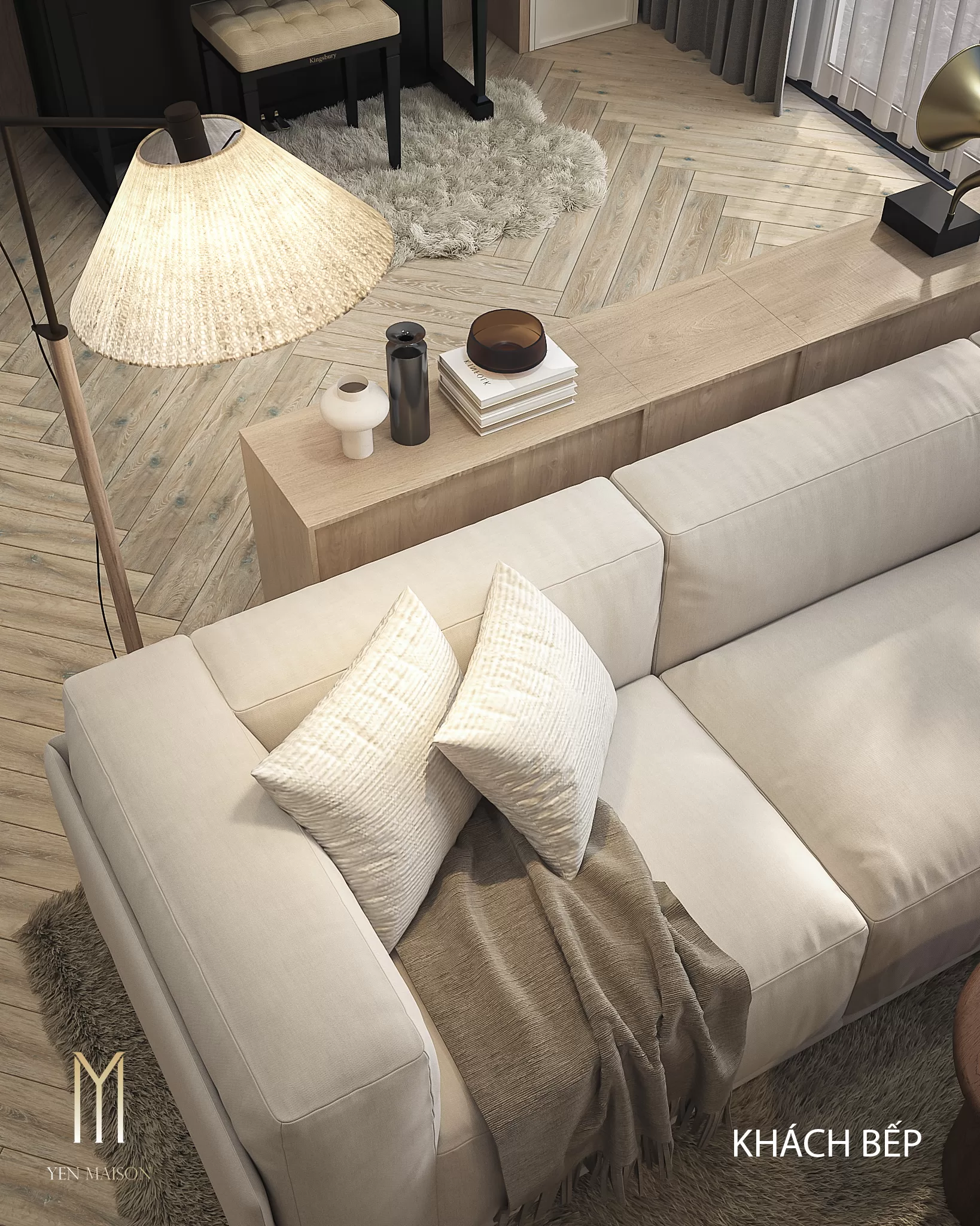 Với phong cách Modern mix Japandi, Yen Maison lựa chọn bảng màu trắng kem kết hợp gỗ sáng để tạo nên một tổng thể nhẹ nhàng và ấm áp. Các chi tiết được tiết chế vừa đủ, để từng góc nhỏ trong nhà đều trở thành khoảng nghỉ dễ chịu sau một ngày bận rộn.